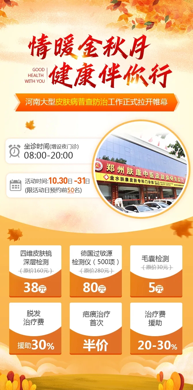 10月30日~10月31日为缓解广大患者“看病难,看病贵,看专家难”的问题,郑州肤康皮肤病医院举办“情暖金秋月·健康伴你行”河南大型皮肤病普查防治活动。