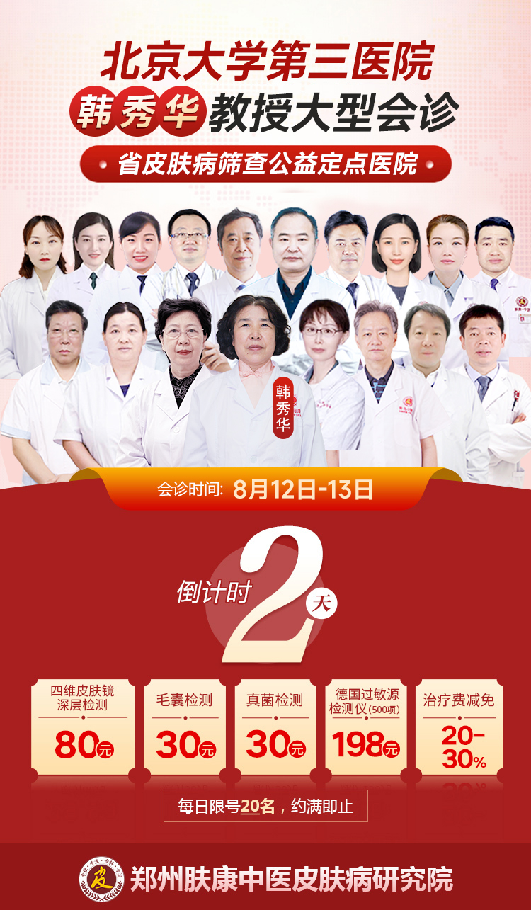本周末专家会诊说明:8月12日至13日,郑州肤康中医皮肤病研究院,特邀北京市di一中西医结合医院【韩秀华】教授联合会诊,会诊期间,专家号每日仅限20名,从速预约,约满即止。