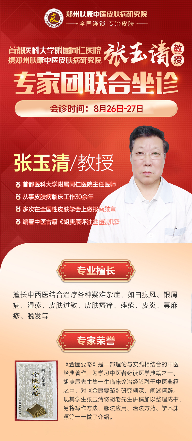 公告:8月26日至27日郑州肤康皮肤科特邀北京张玉清教授坐诊