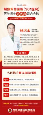 针对当前皮肤疾病就诊高峰的严峻挑战,为切实解决省内疑难皮肤病患者的就医需求,郑州肤康皮肤病医院将于2025年9月6日至7日,特邀北京资深皮肤科名医杨庆永教授莅临我院,开展多专家联合门诊,集众所长,为患者提供高效、精准的诊疗方案。