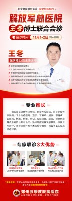 11月1日-2日(本周末),郑州肤康皮肤病医院为帮助河南疑难皮肤病患者早日实现健康无恙解决“看病难、看病贵、看专家更贵”的问题,特邀解放军总院王冬博士莅临肤康进行联合会诊。